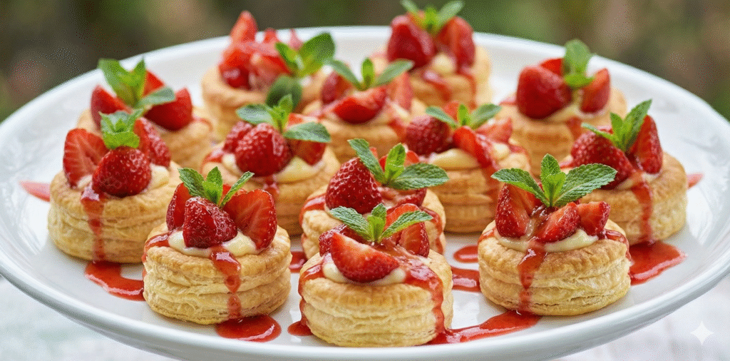 Nossos Mini Folheados com Morango são preparados com massa folhada leve, crocante e laminada à perfeição. Cada unidade recebe um toque de morango fresco, trazendo doçura natural, aroma marcante e aquele contraste irresistível entre crocância e suavidade.